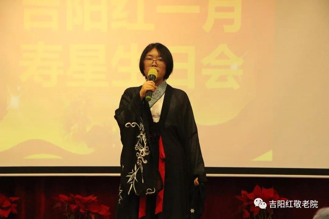 今天的主持人阵容非常的强大,温柔大方的小韩美女,英俊潇洒的宋邦春老师和多才多艺的帅哥吉祥老师。他们幽默风趣的主持风格,总带给我们无限的快乐,让整个会场保持在欢乐中。三位主持人和我们的护理管家介绍每一位寿星,分享着每一位寿星的快乐,看着社会爱心志愿者围绕在爷爷奶奶们的身边,他们给寿星爷爷奶奶点蜡烛,送鲜花,戴寿星帽,他们的爱心温暖了整个吉阳红敬老院,寿星们在大家的祝福中许下美好的心愿! 接着是咱们的全能型歌手陈忠峰老师,他是上海音乐家协会声乐专业委员会委员,上海音乐家协会流行音乐专业委员会委员。曾获全国青年歌唱大赛银奖及“中国达人秀”人气歌手,是《首届长三角演唱大赛》的冠军。今天带来的歌曲《祝酒歌》和《梦一样自由》,极富豪情的歌声,震撼了现场数人 ,响起了爷爷奶奶们雷鸣般的掌声。 紧接着是来自战友之音艺术团的团长何世杰老师演唱的《我和我的祖国》,著名音乐人也是战友之音艺术团副团长姜昊成老师钢琴伴奏,激情澎湃,军哥嘹亮,两位老师将活动氛围推向了高潮。 接下来是石爱予小朋友,今天带来的舞蹈《采薇》,她像一只美丽的精灵在舞台上翩翩起舞,爷爷奶奶们非常喜欢。还记得她是531葛珠仙奶奶的重外孙女,在12月寿星生日会上,为寿星们跳了非常漂亮的舞蹈。 再接着是战友之音艺术团的徐峰女士,今天带来的歌曲《军港之夜》,优美的歌声在生日会场里缓缓回荡,让人赞不绝口,令我们心潮澎湃! 杨稼英小朋友是小荧星合唱团的成员,曾多次参加各类大型演出 ,一曲《送别》,歌声悠扬如清晨带着微点露珠的樟树叶,一直唱到爷爷奶奶们的心里,爷爷奶奶们满堂喝彩。 今天我们还邀请到一位重磅嘉宾,由来自《爱上镜专业演出团》的舞蹈团长刘蓉老师,她也是中国体育舞蹈联合会国家级教师和评审,舞林大会拉丁舞教师,曾参与国内各大体育舞蹈赛事,获得奖项无数。也是2019年全球女神大赛中国总决赛民选冠军。刘蓉老师今天带来的舞蹈《渡风》,仪态优雅,舞步轻快,婀娜多姿,美的让人陶醉。 姜昊成老师不愧是著名的音乐人,一曲《一生报答》,极富深情的演唱,就像平静的湖泊泛起层层的微波,爷爷奶奶们情不自禁地流露出感动和激情的眼泪。
