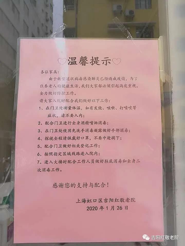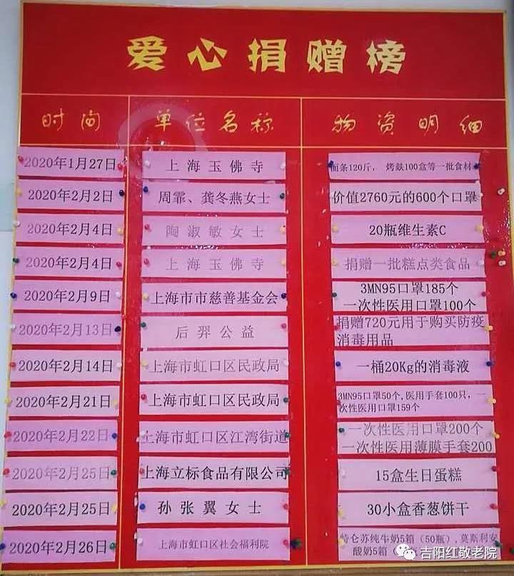 2020年的开端,大家正在欢天喜地迎接着新年,兴高采烈地准备着阖家团圆时,一场疫病从武汉出发向神州大地席卷而来。我们还未搞清楚它姓甚名谁时,它已像一阵突如其来的龙卷风吹来,使这本该充满着阖家欢乐、欢声笑语的美好时节里,人们的内心变得压抑、恐慌! 吉阳红敬老院第一时间开展了疫情防控阻击战,根据上海市启动重大突发公共卫生事件一级响应机制,为杜绝可能的传染源进入住养老人的生活区域,保障老人和员工的生命安全以及身体健康,我们养老院发布《关于加强探视管理工作的通知》,暂缓家属探视与外来咨询业务。并且做好养老院服务的各项管理工作,对内部消毒、电梯管理、门岗管理、家属探视、返沪员工健康留观等具体事项进行部署。严格落实人员出入制度,加强院内感染控制,做好特殊时期的照护服务工作,做好老人和护理人员的复岗前隔离观察等等。 在这里,我们看到了一线护理员、保洁员、后勤保障员、医务人员,恪尽职守、勇于担当,不惧危险、不辞辛劳,守望相助、众志成城。上海市虹口区民政局、江湾镇街道等各个部门,及众多的家属、朋友们及社会各界爱心人士在背后默默支持吉阳红的疫情防控工作,捐口罩、捐善款等等,雪中送炭,温暖了这个不平凡的春节。 正因为有你们,以各自平凡的坚守,筑起了一道严实的防护“围墙”,切实保障了老年人和员工的生命健康,感谢你们!