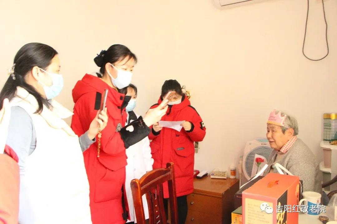 虽然因为疫情的缘故,我们二月份的寿星生日会不能像往常一样举办热闹的集体庆生活动,志愿者们也不能进来为爷爷奶奶们表演精彩的节目。但是,在我们吉阳红这个温馨有爱的大家庭里,我们为寿星爷爷奶奶们准备过一个不一样的生日!一个非常有意义的生日!一个别具新颖的生日! 2月25日,怀着最诚挚的祝福,带着最美的康乃馨,院长带领我们管家特意到每一个寿星老人房间为爷爷奶奶们庆生,给爷爷奶奶们送上美味的蛋糕,戴上生日帽,陪寿星们唱生日歌,还有精心准备的生日礼物,在这欢快的过程中,陈院长为二月寿星全程直播送祝福!