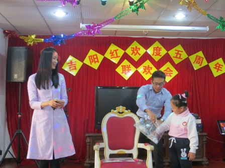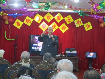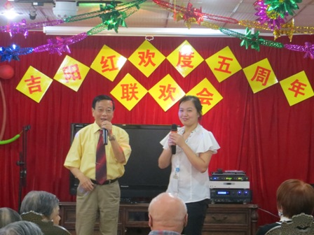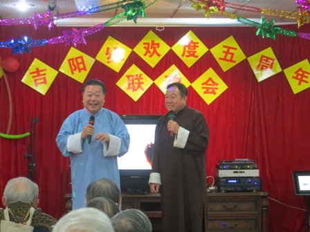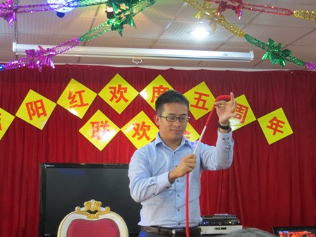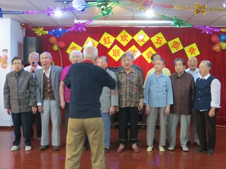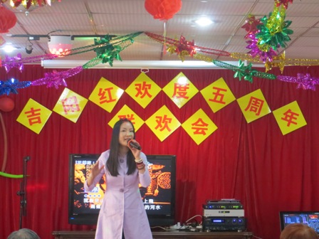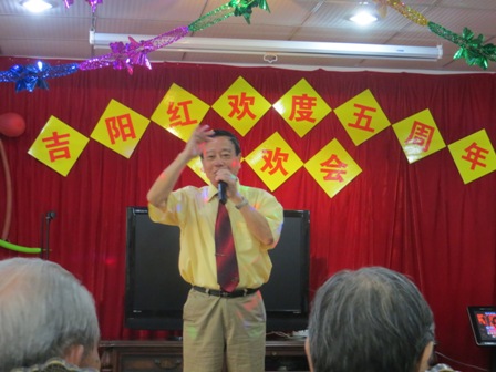 今天这个喜庆的日子,自然少不了精彩的表演,有笑口常开艺术团的演员们给我们带来了个人独唱、相声、滑稽秀;志愿者安安美女献上动听的歌曲表演;爷爷们(樊熊敏爷爷、蔡元俭爷爷)自己拿手的高亢的歌曲演唱;魔术师郭先生的神秘、惊奇的魔术秀;要总与陈爱琴奶奶的歌曲合唱,如此精彩的表演看的爷爷奶奶目不暇接,笑口常开。最后吉阳红五周年庆欢乐会在爷爷奶奶的大合唱中画上了圆满的句号。