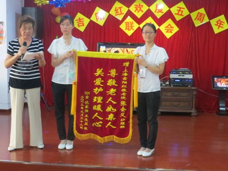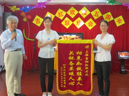 2013年9月29日下午2:30分庆祝吉阳红敬老院五周年院庆欢乐会,在这个特别的日子里也请来了上海市社会福利行业协会笑口常开艺术团的演员们和我院的欢乐大使滑稽演员徐笑灵老师担任我们的主持。欢乐会以一个简短的护理管家视频拉开序幕,这些护理管家都是曾经在我院与爷爷奶奶一起开心过、欢笑过的有爱心孩子们,他们从远方给爷爷奶奶送来了祝福给吉阳红送来了祝福,借此好日子我们也祝福他们每天开开心心,吉祥如意。然而还在吉阳红的护理管家也自然得送上自己最真挚的祝福,她们一起合唱院歌“吉阳红之歌”以表达她们对爷爷奶奶和吉阳红的祝福,护理员吴美琴阿姨也以歌声的形式代表所有的吉阳红员工送来了祝福;同时特别的日子也收到了特别的礼物,那就是401室沈家骅爷爷和501室沈家恒爷爷王忠英奶奶赠送的锦旗两面,这是对吉阳红最大的肯定以及鼓励,我们要继续努力把我们的服务做好,让老人满意,家属放心!感恩爷爷奶奶,感恩吉阳红,感恩一切!