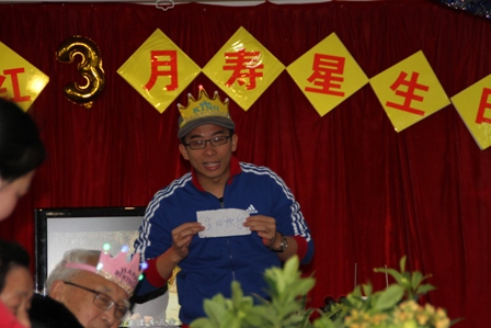 下午2:30一到,三月寿星生日会准时开始了。我院的主持人一一介绍了我院三月生日的老人。在这次介绍中,让人印象深刻的是住在我院317室的何志贤爷爷和张美玲奶奶。因为他们不仅是一对恩爱的夫妻,而且生日还是在同一个月份的,这种缘分真是羡煞旁人。当大家还在祝福这对恩爱老夫妻的时候,我们听到了一个让人遗憾的消息,就是居住在607室的蔡元俭爷爷要离开我院,回到女儿家里养老了。蔡爷爷在生日会上发言,表达了自己的不舍,最后还给我们高歌了一曲《我骑着马儿过草原》,同时我院的工作人员和爷爷奶奶也纷纷向蔡爷爷送上自己的祝愿。