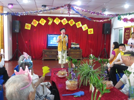 工作人员有条不紊得把鲜花,蛋糕,礼物都放在桌子上,轻快的生日快乐歌也提前的唱起来了。随着准备工作的完成,七月寿星生日会也就开始了。生日会的第一个环节就是介绍当月生日老人的情况,主持人边介绍边说了老人的生活小故事,有王宝奇爷爷和姚菊雅奶奶的恩爱小事,也有金林华爷爷与黄生表爷爷互帮互助的感人事件,在这个过程,大家都对爷爷奶奶有了一定的认识。生日会怎么少得了生日歌呢,在主持人的带领下,全场老人与志愿者一起唱了生日快乐歌,我们的祝福都渗透在了我们每一句歌词里。