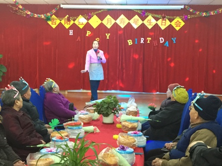 今天是阳历2016年1月17日,农历的腊八节。尽管满地余寒凝露香,但是凝不住大家绝美的容颜,像往常一样工作人员早早的就布置好了寿星生日会会场,准备好生日礼物。欢快的音乐飘在吉阳红的上空,寿星们也陆续的坐到了属于他们的位置,其他的爷爷奶奶带着自己的祝福也入座了。