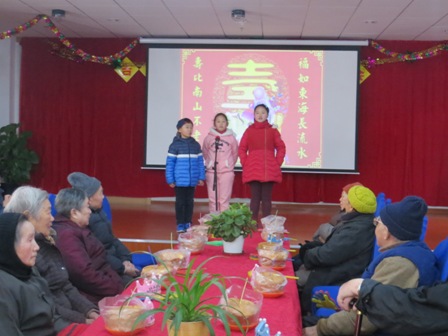 舞台上三个可爱的孩子把自己的祝福送给了今天的寿星们,也给在座的每一位嘉宾拜了个早年。主持人走上了舞台宣布一月寿星生日会正式开始。两位实习护理管家来到了舞台中央向大家介绍了本月寿星,并送上了真挚的祝福,祝愿爷爷奶奶们福如东海,寿比南山。紧接着狮子会的志愿者们给爷爷奶奶们点蜡烛,带寿星帽,唱生日歌,送礼物。 每次生日会我们都少不了精彩的节目,也少不了我们的老朋友张红玉老师,这次张红玉老师给大家带来的是一个笑话,惹得大家捧腹大笑。我们今天还有一个最年轻可爱的节目,王硕诚小朋友给大家唱了一首小星星。六位温婉美丽的大姐旗袍登场,经典怀旧的旗袍秀令观众大呼惊艳!不时又显优雅清新,经典旗袍秀带来的浓浓的东方风情真是一大看点。我院的阿姨也是多才多艺的,身穿粉红色工服的晋阿姨给大家带来了一曲花鼓戏,博得了一片掌声。美丽的亓肖肖女士给大家带来一段深情的歌曲《爱如空气》,郭永旺老师又一次给大家带来神奇的魔术表演,深受大家的喜爱。欢乐的时光总是过得很快,随着要总的讲话我们的表演也进入尾声,最后以狮子会志愿者的合唱《祝你平安》结束了整场活动。