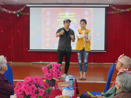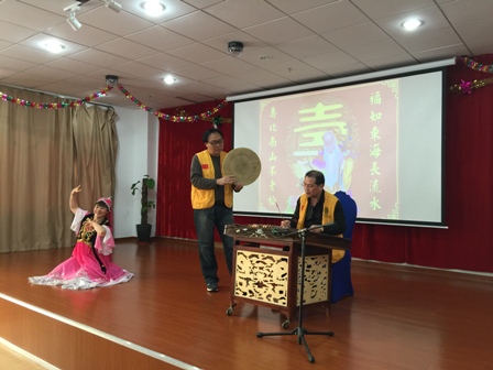 在这欢乐祥和的时刻怎么会少得了精彩的节目呢?第三个环节就是我们的志愿者送祝福及节目表演啦。这一次的节目着实让我们目瞪口呆,吹拉弹唱跳还有魔术表演,个个都是精彩至极。喜庆的节日就要有喜庆的欢歌,第一个节目扬琴独奏《节日的天山》由上海东方国乐团王国敏演奏、手鼓伴奏徐福海、伴舞芦秋香,迅速带动了整个现场的气氛;二胡独奏《赛马》令人随着跳荡的节奏而心潮起伏,让我们仿佛置身于骏马在草原上狂奔的情景中,不由得让我们对内蒙古大草原上骑骏马,喝美酒的惬意生活无限神往,而此时上海才艺歌友会芦秋香带来的《一杯美酒》正如愿满足了我们;紧接着军旅歌手何世杰带来的歌曲《小白杨》《红星照我去战斗》又直接让我们骑着俊马从内蒙古大草原回到西北来,白杨树它傲然挺立的身影更是让我们仿佛看到那英姿飒爽守卫家乡的哨兵;张钦瑜琵琶独奏《阳春白雪》我们是直接感受到了春意怏然的气息;聂燕带来的《青藏高原》以及会敏带来的《感恩的心》也是引起了现场掌声不断;我们吉阳红朝鲜抗战老兵赵文涛爷爷则主动要求上台清唱了一首朝鲜歌,为我们本月寿星爷爷奶奶祝贺;最后要总倾情演唱地一首《爸爸》不仅让自己热泪盈盈更是感动了现场所有的人;随着吉阳红的老朋友郭永旺先生精彩诡秘的魔术表演,我们的生日会也逐渐落下了帷幕。